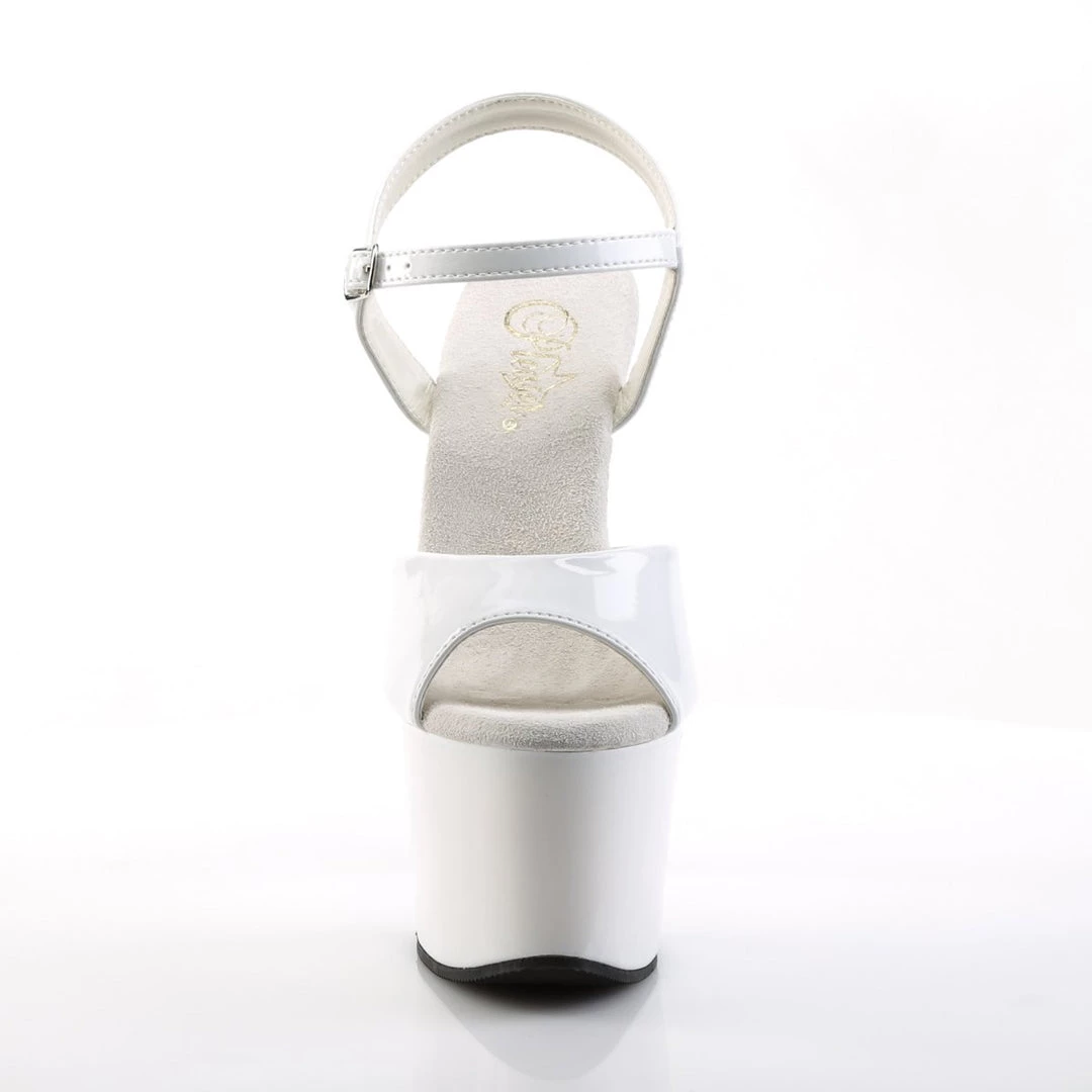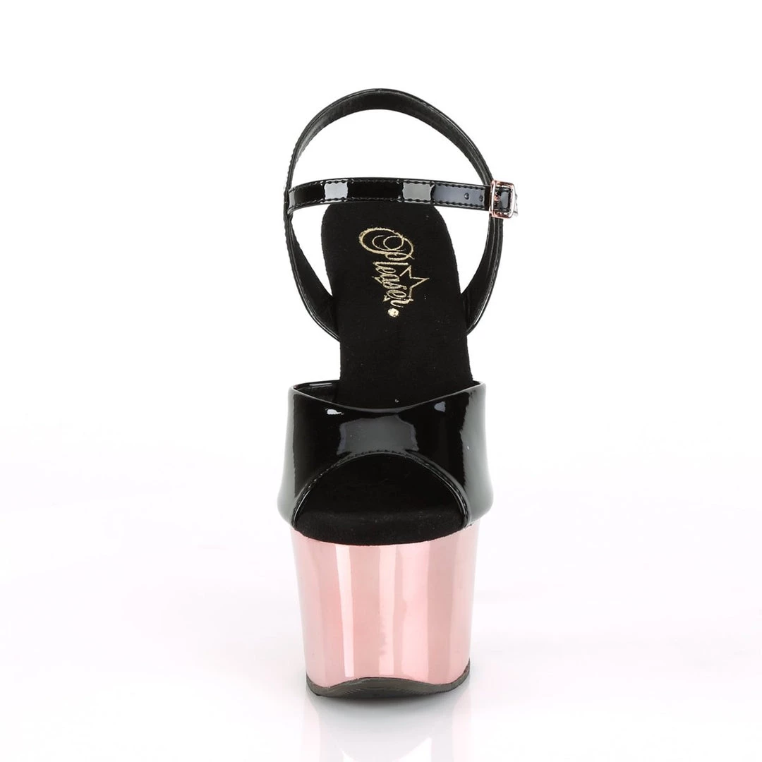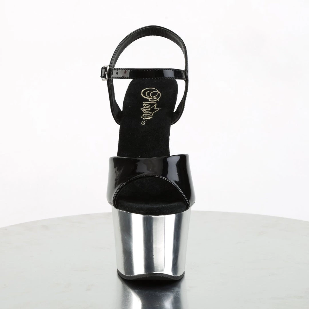 A fabulous ankle strap sandal. Single toe strap with wider sides and thin middle, ankle strap with side metallic buckle closure and supporting side straps, 2.75 inch front platform and high 7 inch high heels. Chic and comfortable, these sandals can be paired up with a variety of outfits for a sexy look.