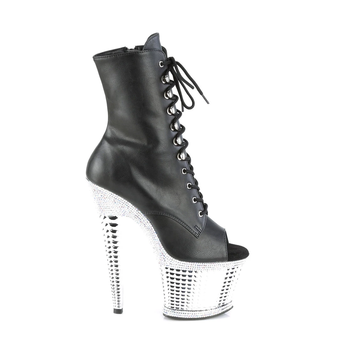Add it to your bling shoe collection! A 7″ (178mm) heel, 3″ (76mm) textured PF peep-toe lace-up front ankle boot featuring silver multi rhinestones and chrome-plated platform bottom, inside zip closure.