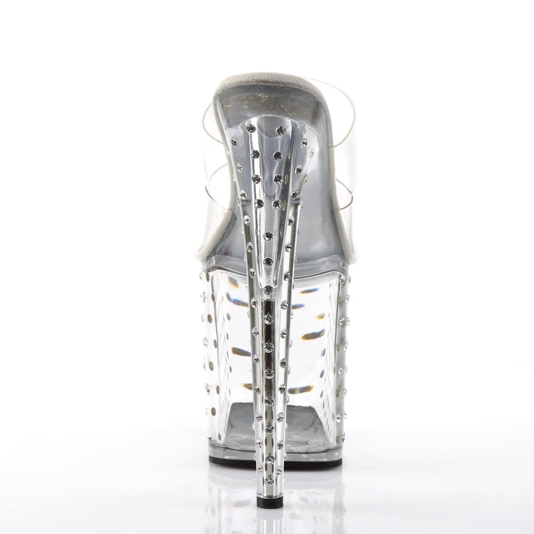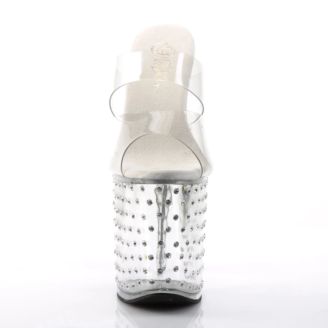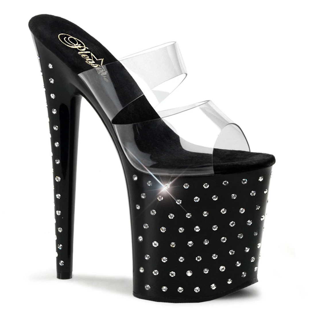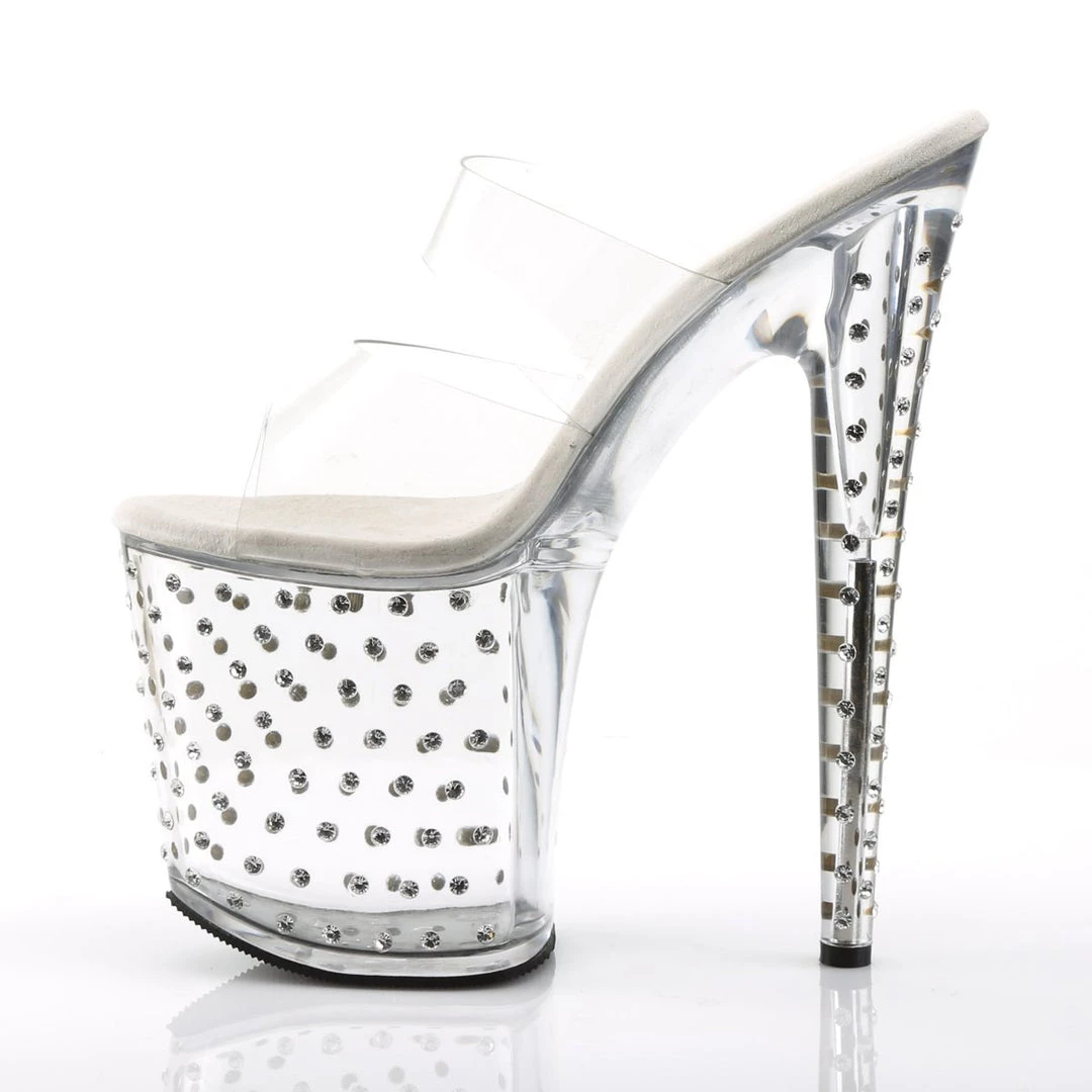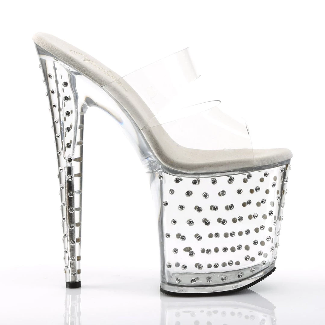 Clear Double strap Rhinestone Studded Platform Slide. This undeniable offering boasts a translucent upper so all you see are curves concocted by the tremendous 8-inch heel and 4-inch platform studded with rhinestones for a star-crossed look. The inner sole is padded with soft fabric for added comfort and great feel.