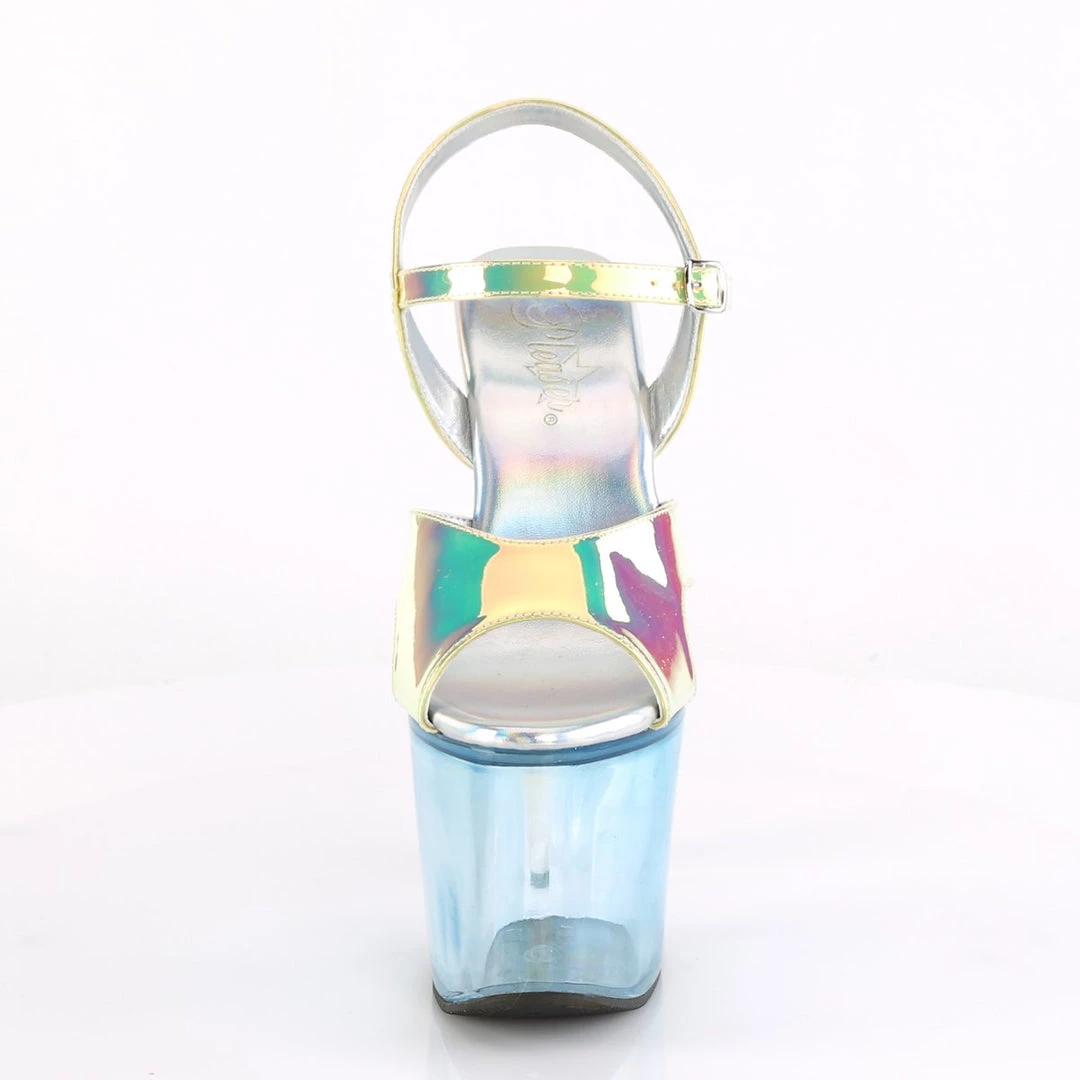 Fantastical 7″ (178mm) heel, 3 1/4″ (83mm) platform ankle strap sandal featuring tinted platform bottom and ombre glitter unicorn heel.
