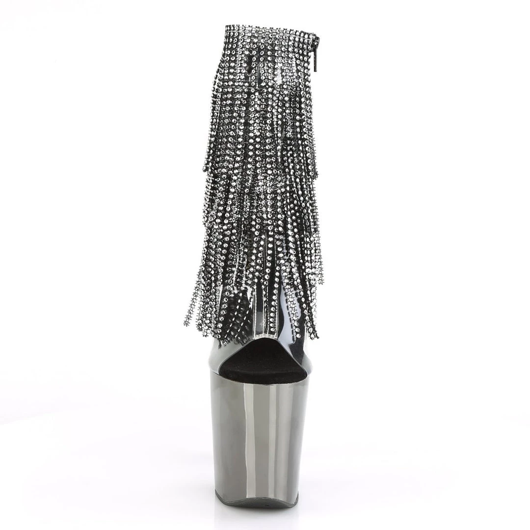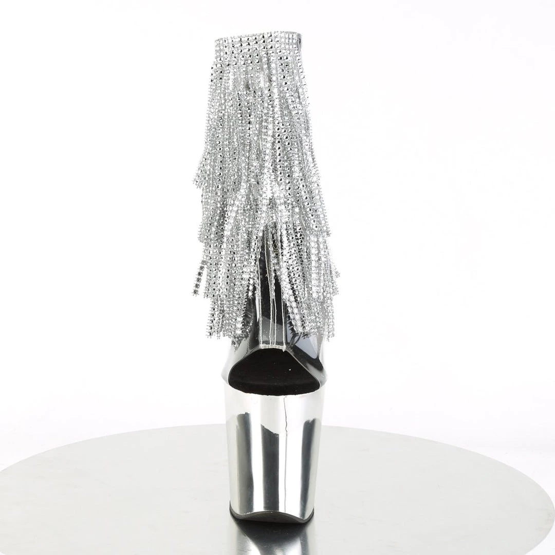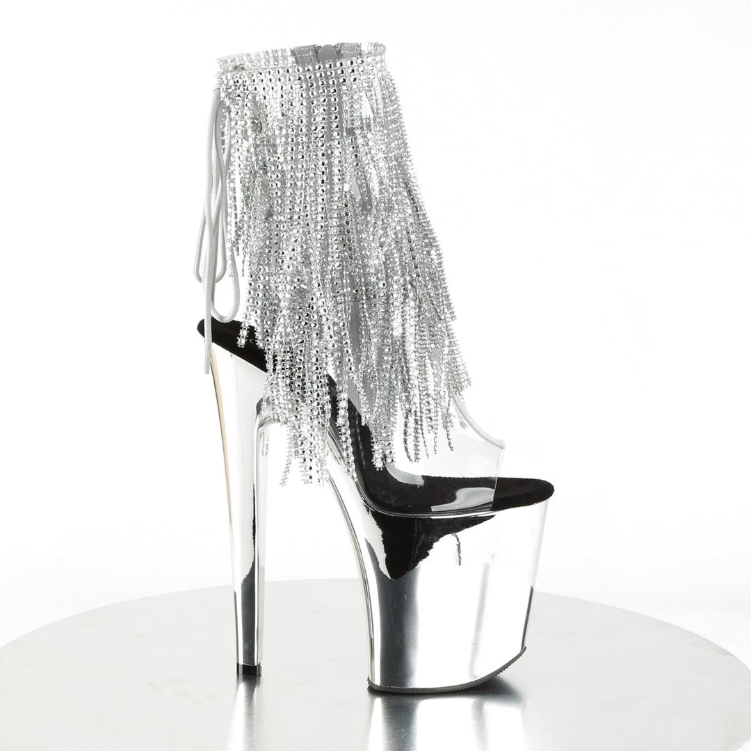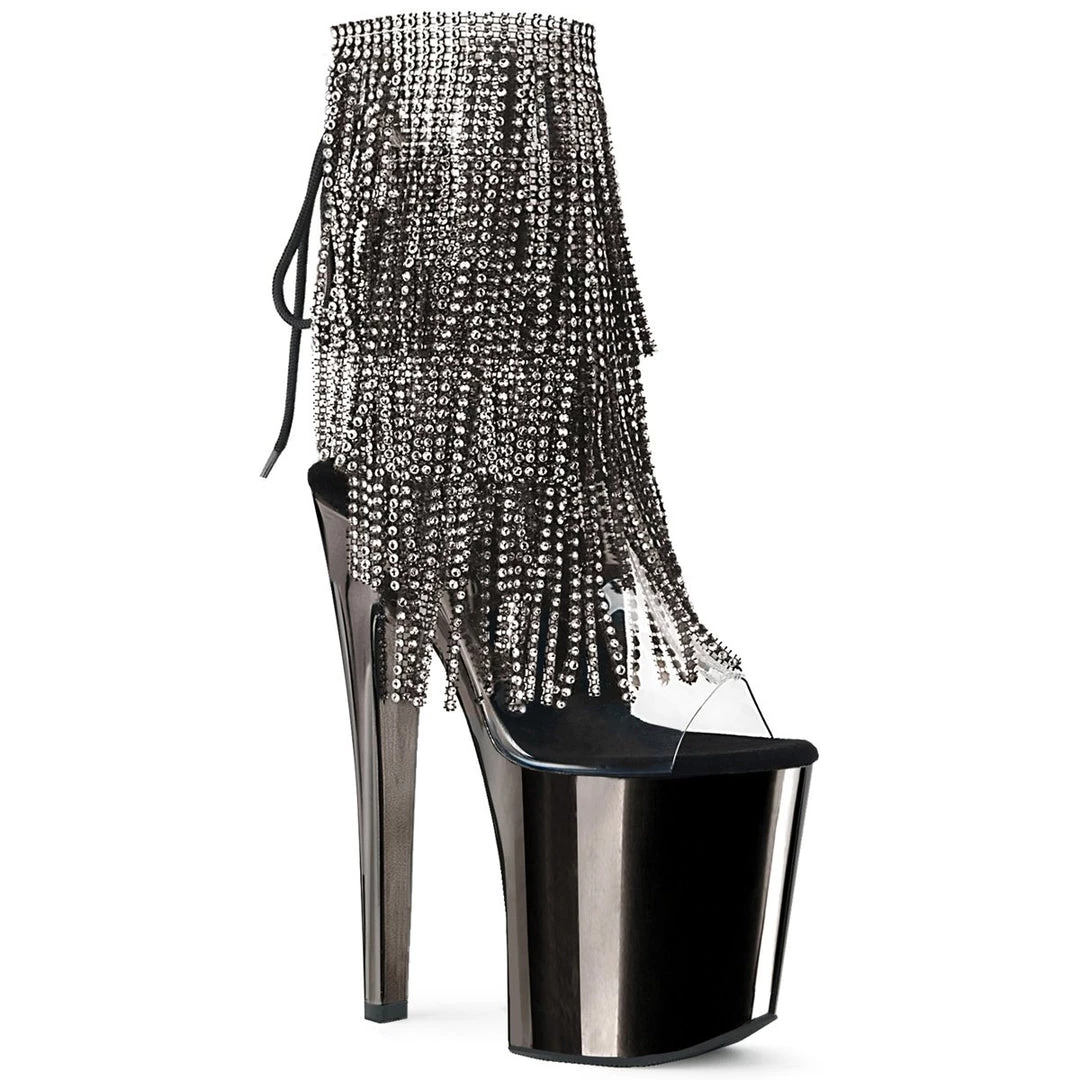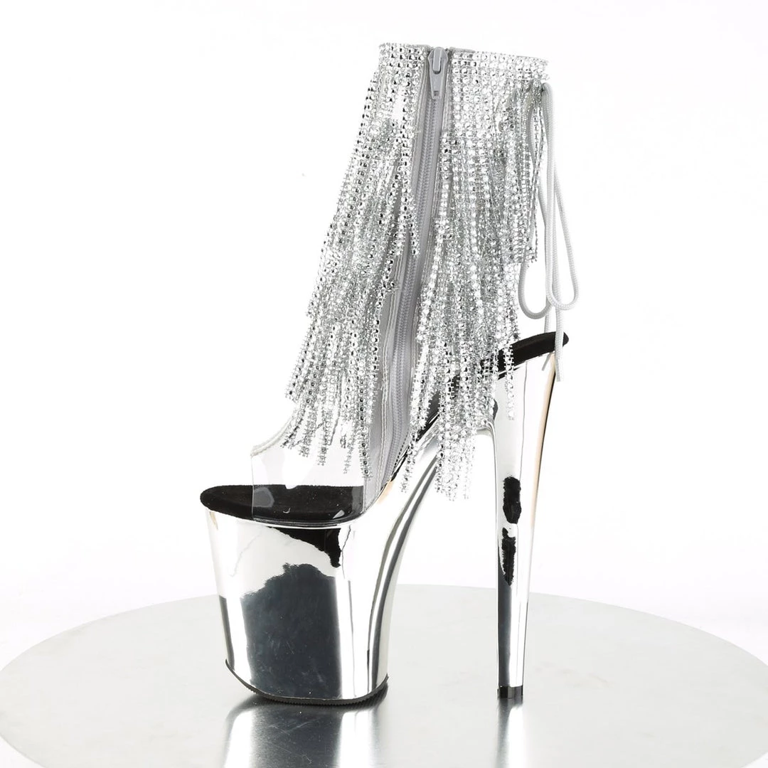 Gorgeous 8″ (200mm) heel, 4″ (100mm) chrome plated platform open toe/heel back lace up ankle boot featuring 4-layer chrome plated, simulated rhinestone fringe with full inside zip closure.