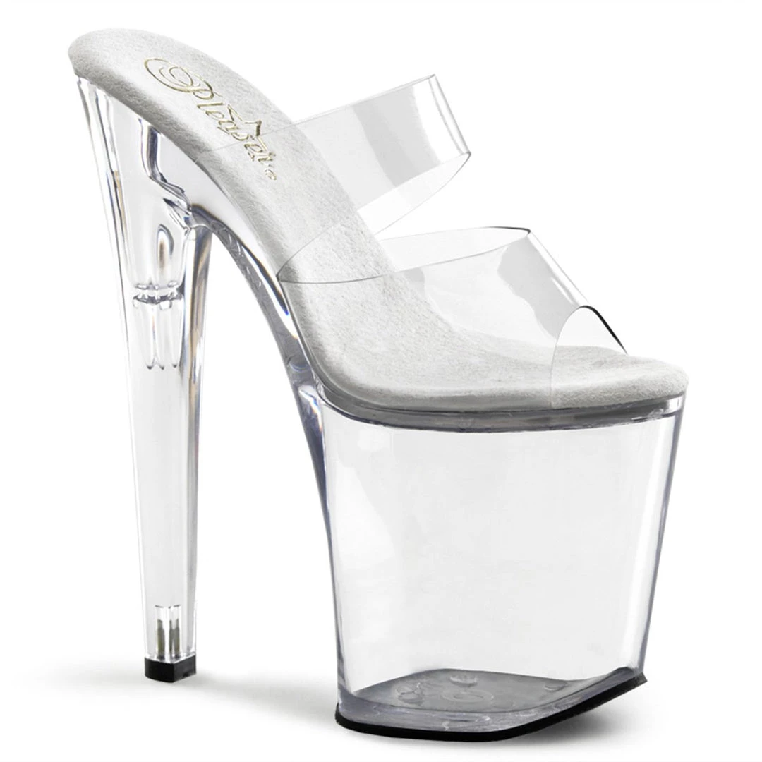 Double strap clear mule with open toe slide sandal features 8-inch heel and 4-inch platform create unforgettable curves wherever people wonder. these mules will give the impression you are walking barefoot, thus enhancing your height and sculpting your feet for a provocative look.