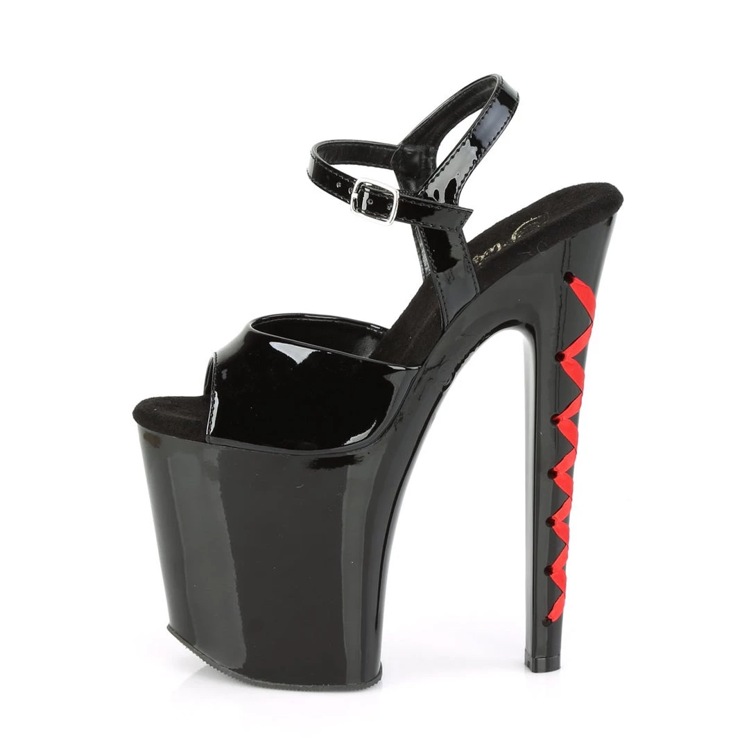 Seduce in these gorgeous 8″ (200mm) heel, 4″ (100mm) platform ankle strap sandals featuring contrast color corset laced heel.