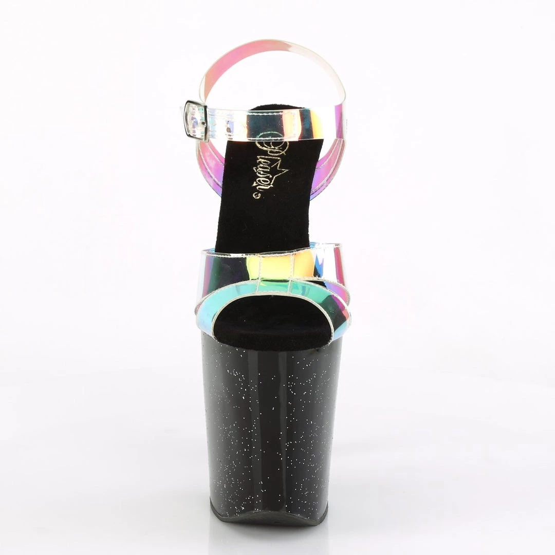 Attention grabbers! Sleek 8″ (200mm) heel, 4″ (100mm) platform ankle strap sandal featuring mini iridescent glitters on the entire base.