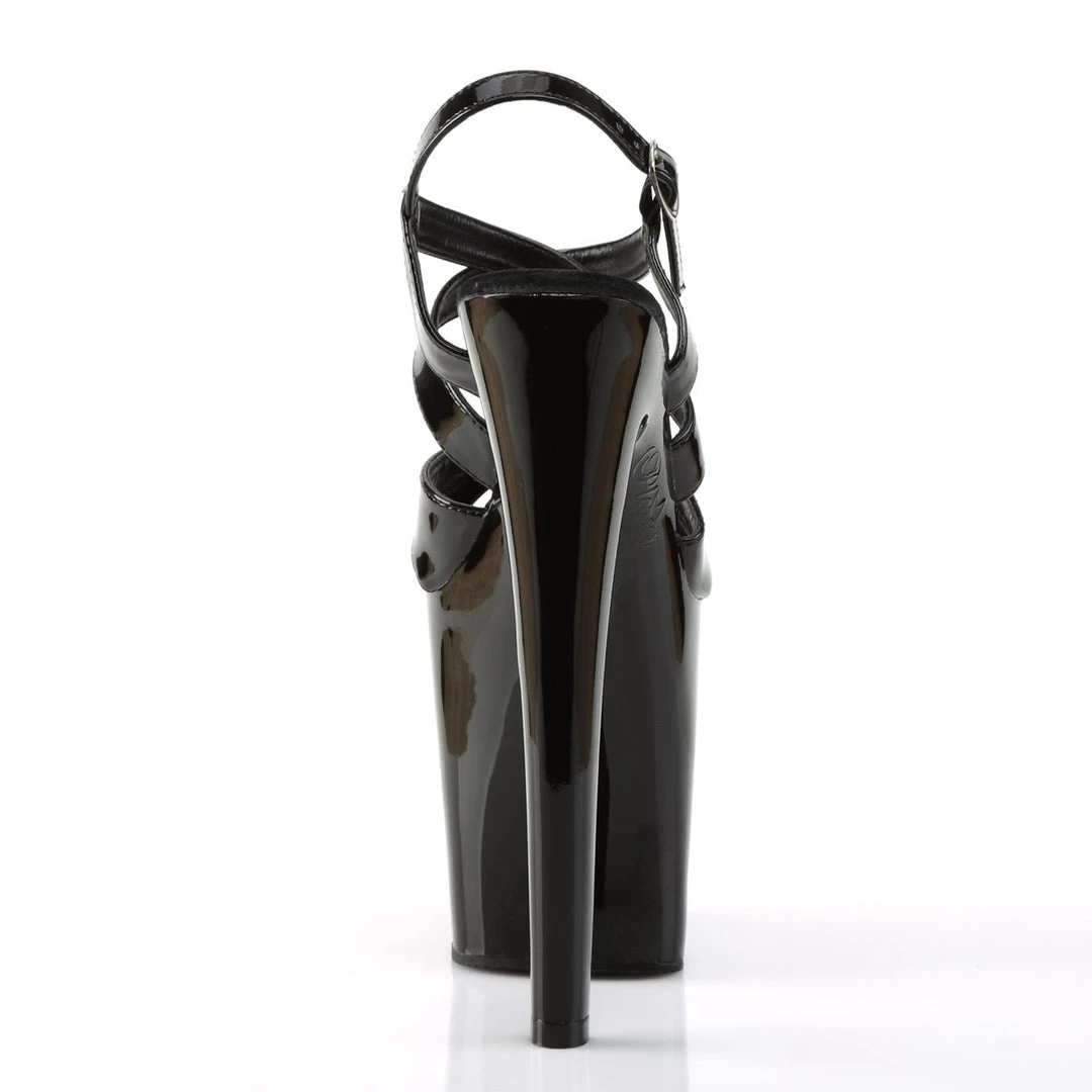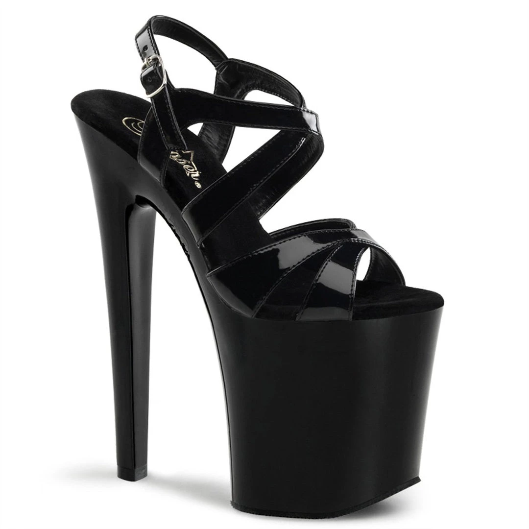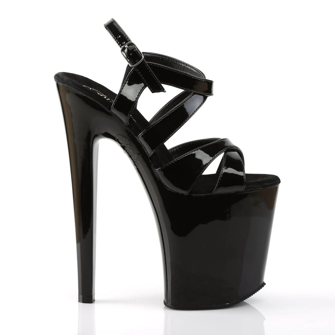 This daring style from Pleaser takes fashion to the Xtreme. The dramatic sandal features slender criss-crossing ankle and vamp straps atop its sky-high heel and platform. Jaws are sure to hit the floor as you parade by in this head turner.