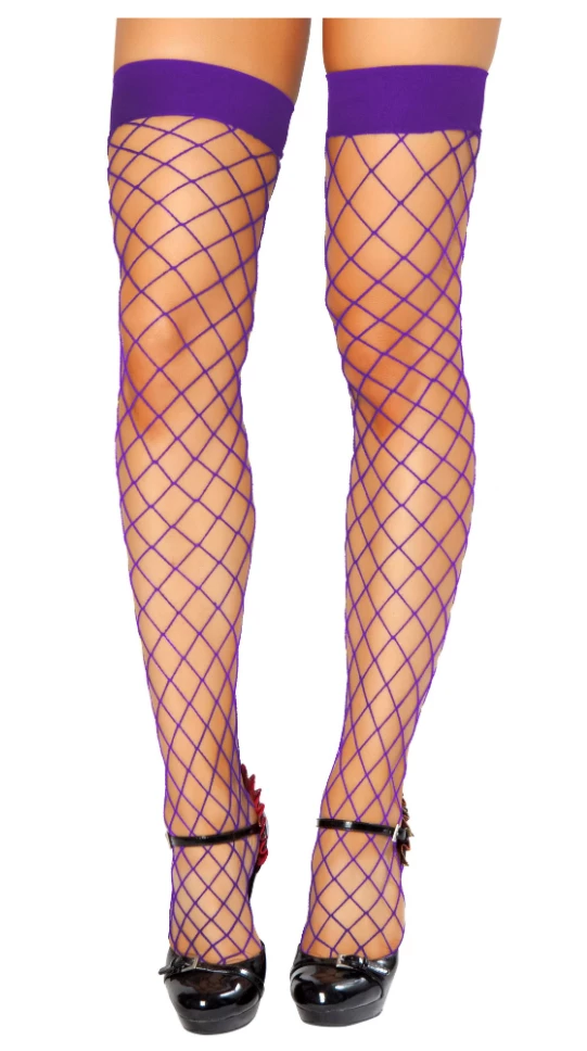 Thigh-high open fishnet stocking.