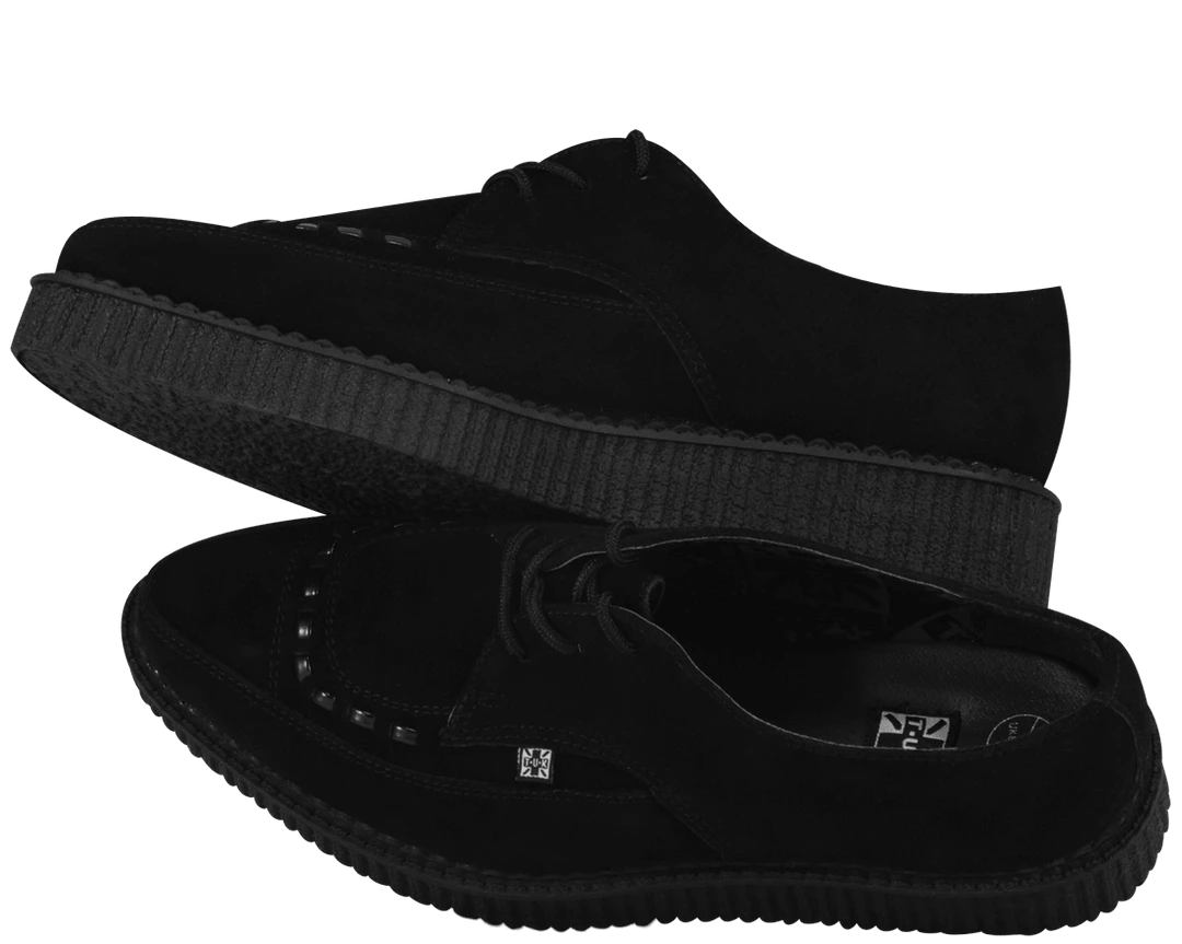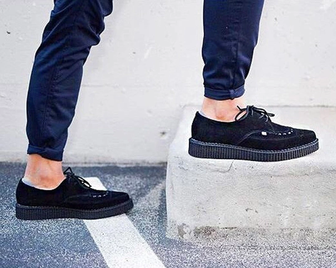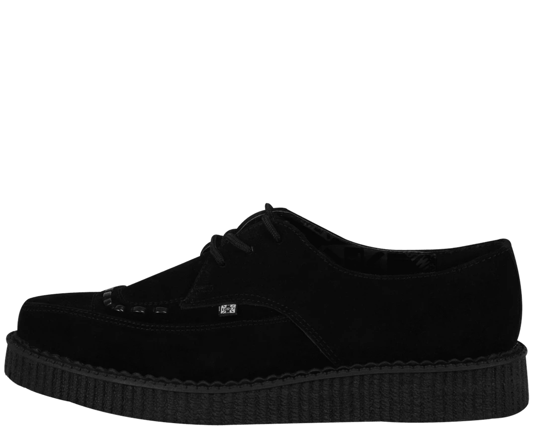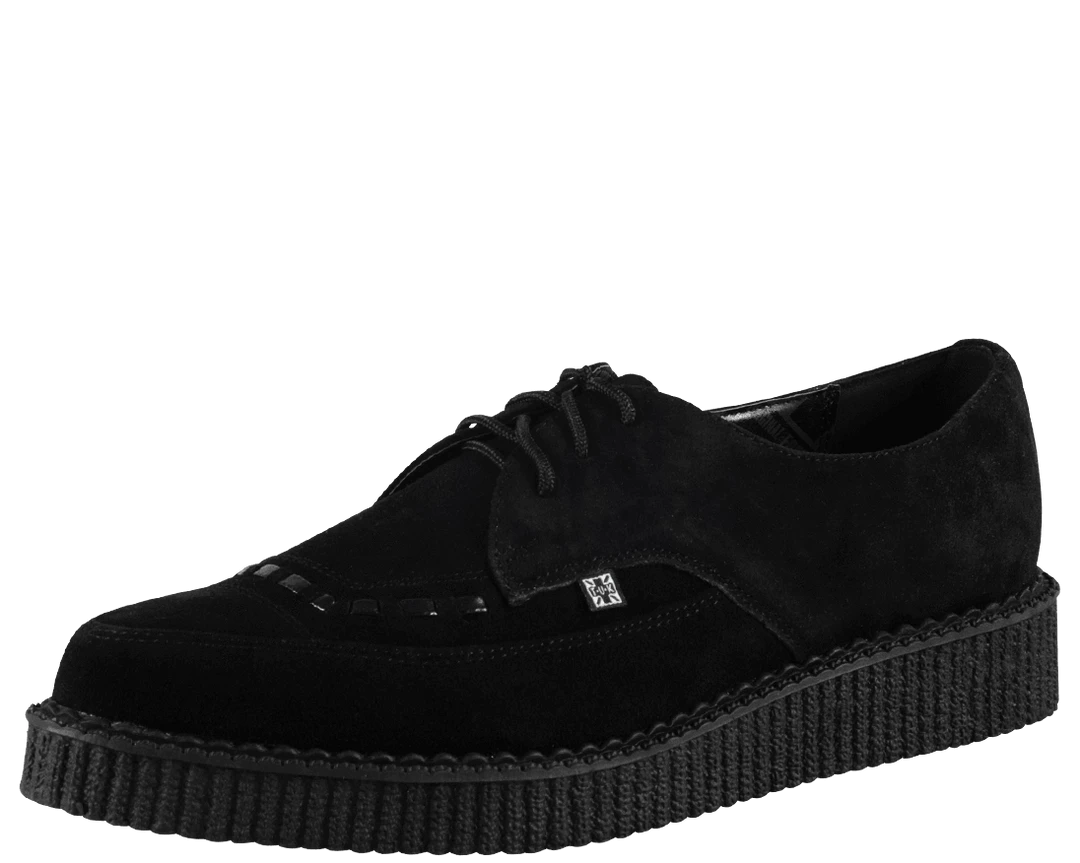 Get to the point in these T.U.K. Original pointed toe creepers! Upper is black cow suede and features black interlace on the vamp. Lace up closure. The T.U.K. Pointed Creeper sole is about 1 1/4 inches high. This shoe has a narrow front, consider a size up for wider feet. T.U.K. Creepers are sold in U.S. men‚Äôs sizes. This is a UNISEX style. If you would like to purchase a Women’s size please subtract 2 sizes to convert to Men’s. For example, if you would like to order a Women’s size 7, please order a size 5.