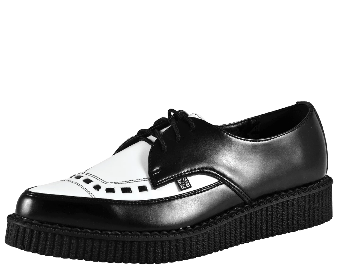 You’re sure to look sharp in these pointed creepers! The majority of the upper is black leather while the vamp is white leather with black stitch and interlace detail. Lace up closure. T.U.K. pointed creeper sole is about 1 1/4 inches high. This shoe has a narrow front, consider a size up for wider feet. T.U.K. Creepers are sold in U.S. men‚Äôs sizes. This is a UNISEX style. If you would like to purchase a Women’s size please subtract 2 sizes to convert to Men’s. For example, if you would like to order a Women’s size 7, please order a size 5.