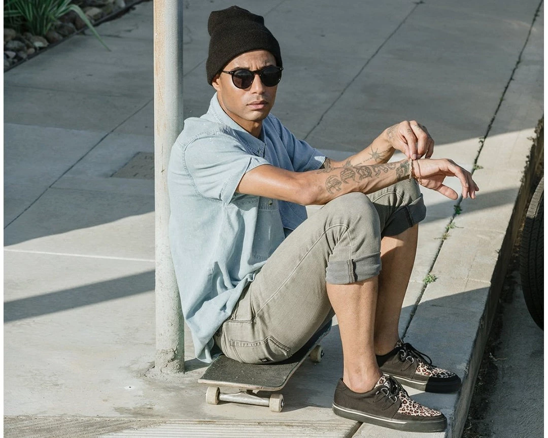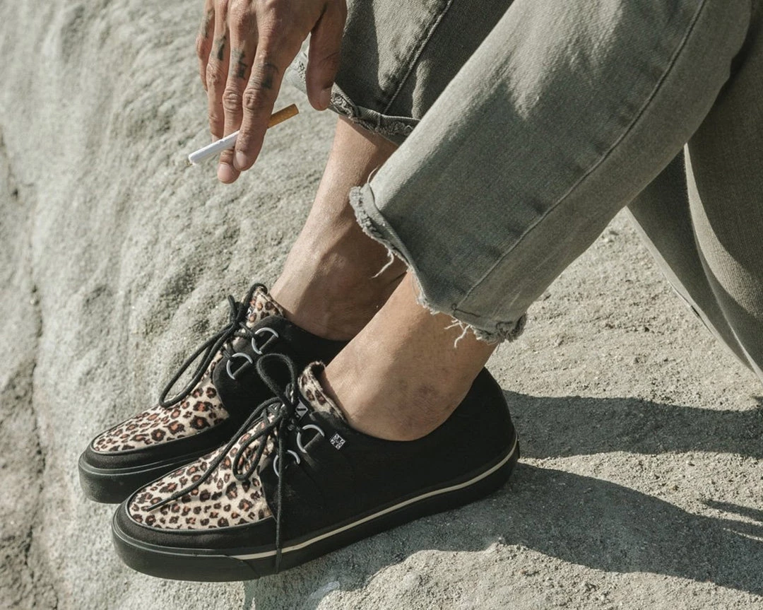 Normal is boring! Get ready to hit the stage or the streets in these vulcanized sneakers that reimagines the former creeper sneaker silhouette with bold & modern twists. Features a vegan black twill upper & leopard faux fur with classic D-rings & iconic interlace detailing along the front. The fun animal print gives an extra dose of rock n’ roll that looks great on guys & girls alike!
