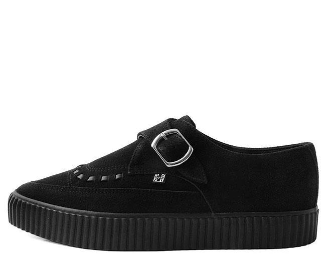 Strap into top-notch style with this baby. A twist on one of our most-loved creepers, features an all-black vegan friendly PU suede upper combined with a classic sleek pointed toe construction and monk buckle strap. Sits on top of our lightweight and durable EZC 1” ridged rubber sole with memory foam padding for all day comfort.