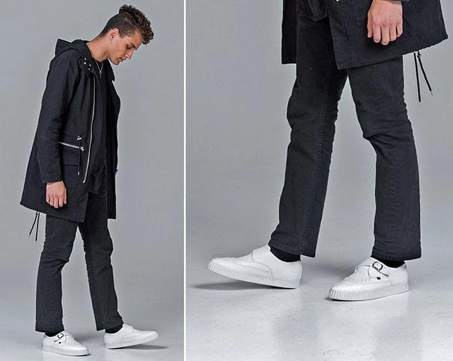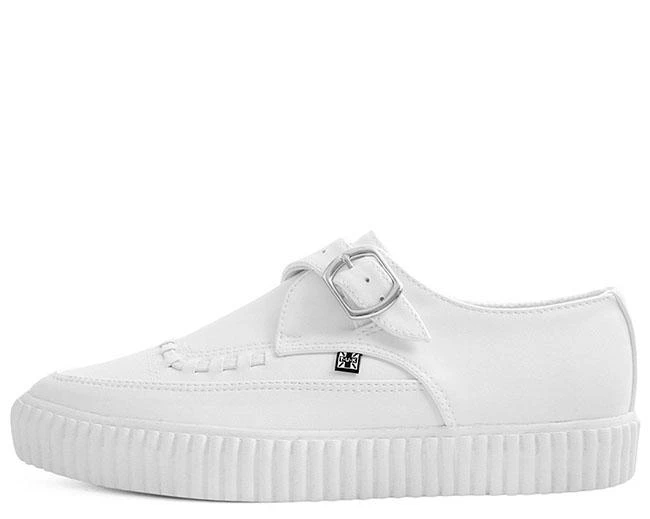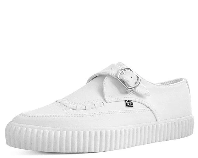 Strap into top-notch style with this baby. An all-white vegan friendly faux leather upper combined with a sleek pointed toe construction and monk buckle strap. Features our lightweight and durable EZC 1” ridged rubber sole with memory foam padding for all day comfort. This creepers’ clean and minimalistic approach makes these an easy go-to staple to match with everything in your closet.