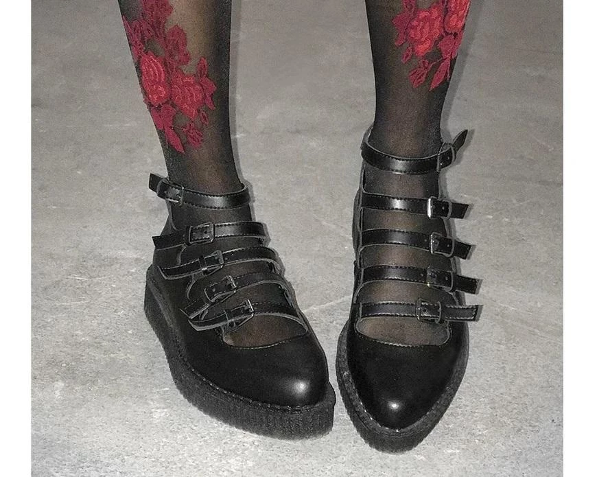 Take center stage in on pointe style with these Mary Jane ballet-style creepers that delivers a whole lot of edgy panache. Made of our high quality TUKskin™ material — polishable synthetic faux leather that is both soft and breathable. Features a pointed-shaped toe and multi-strap closure for an adjustable fit. Sits on top of a low sole creeper platform that measures 1 ¼” at the heel and ¾” in the front. Has a back zipper for easy on/off wear and removable memory foam padding for added comfort.