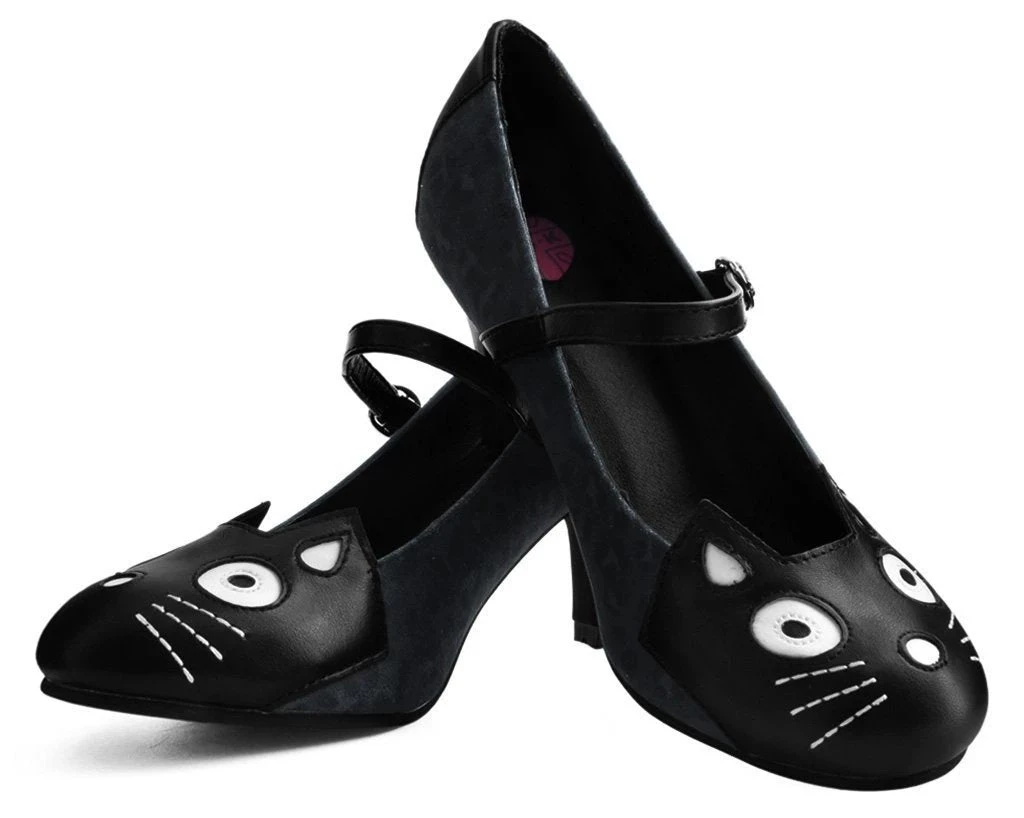 Play up your wild side in these mega cute kitty mary jane heels. Detailed with our signature kitty face and tail along the heel. Features our most comfortable anti-pop heel that is approximately 3” high and has a vegan friendly black & grey leopard print microfiber upper.