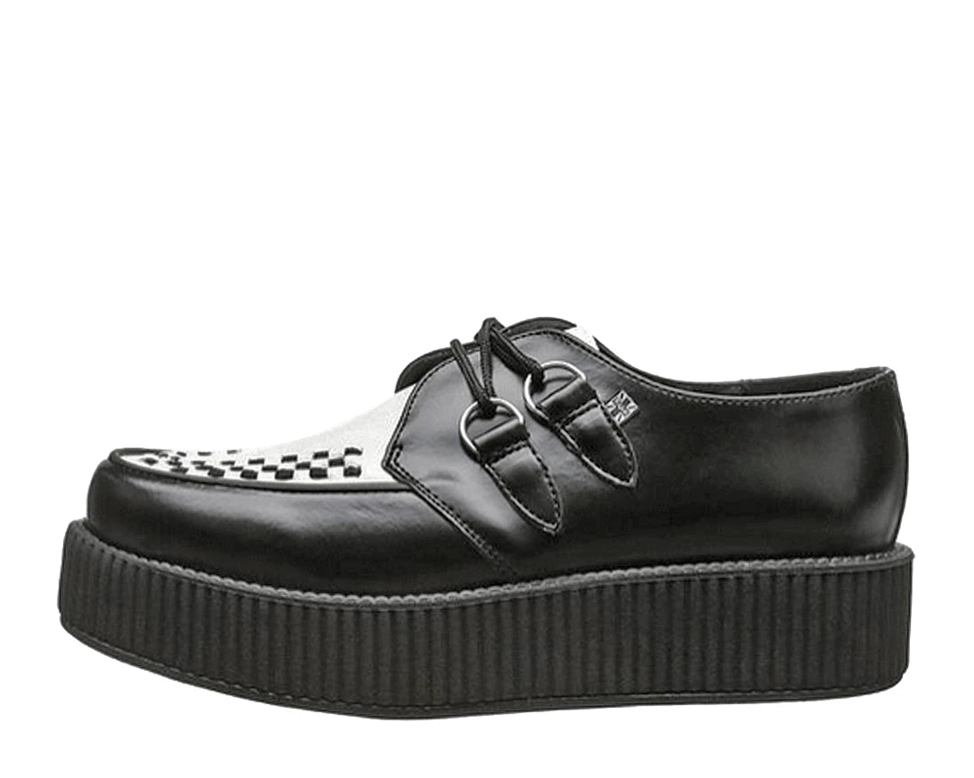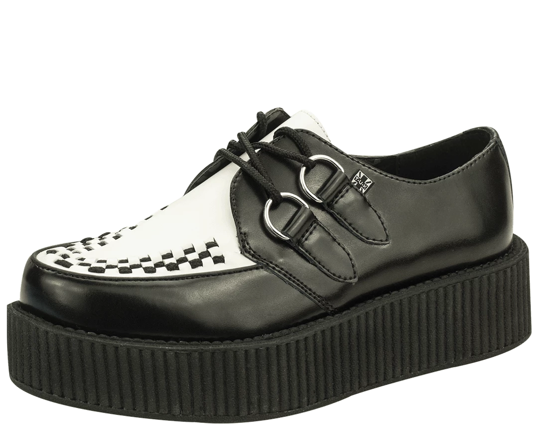 These black and white leather T.U.K. Viva Mondo Creepers look stylish and feel lighter than ever with the new lightweight and more flexible soles in the traditional 1 7/8″ Mondo height. These round toe creepers have a black woven interlace, and silver metal D-rings. T.U.K. Creepers are sold and labeled in U.S. men’s sizes. This is a UNISEX style. If you would like to purchase a Women’s size please subtract 2 sizes to convert to Men’s. For example, if you would like to order a Women’s size 7, please order a size 5.