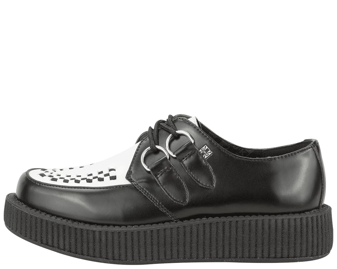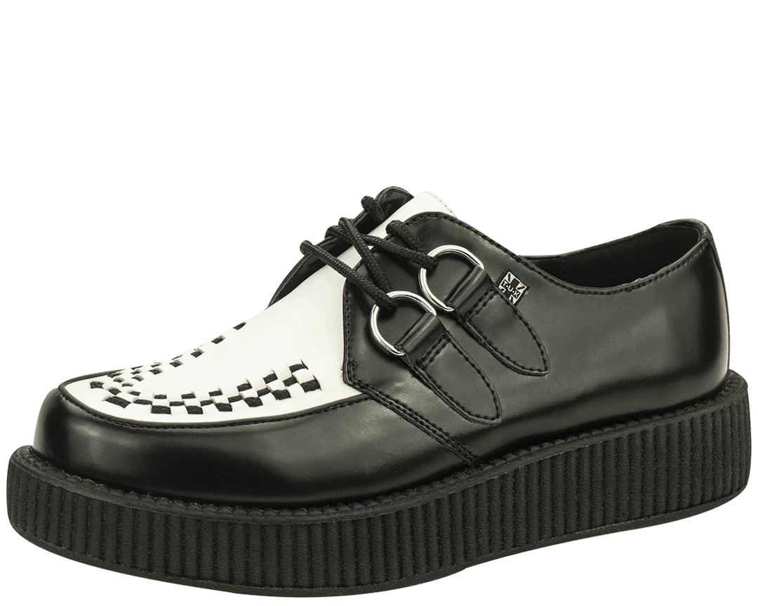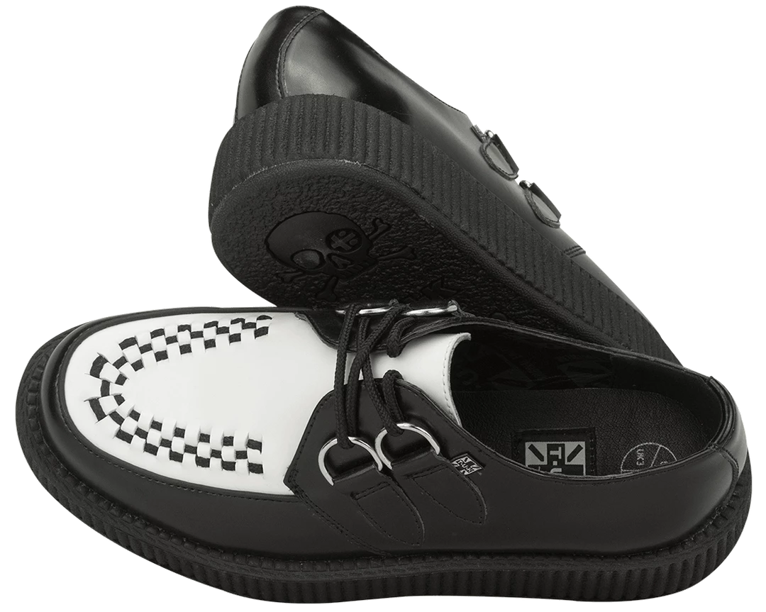 These black and white leather T.U.K. Viva low sole Creepers feature the new lightweight and more flexible soles in our traditional 1 1/2″ height. These creepers have a black woven interlace, and silver metal D-rings. T.U.K. Creepers are sold and labeled in U.S. men’s sizes. This is a UNISEX style. If you would like to purchase a Women’s size please subtract 2 sizes to convert to Men’s. For example, if you would like to order a Women’s size 7, please order a size 5.
