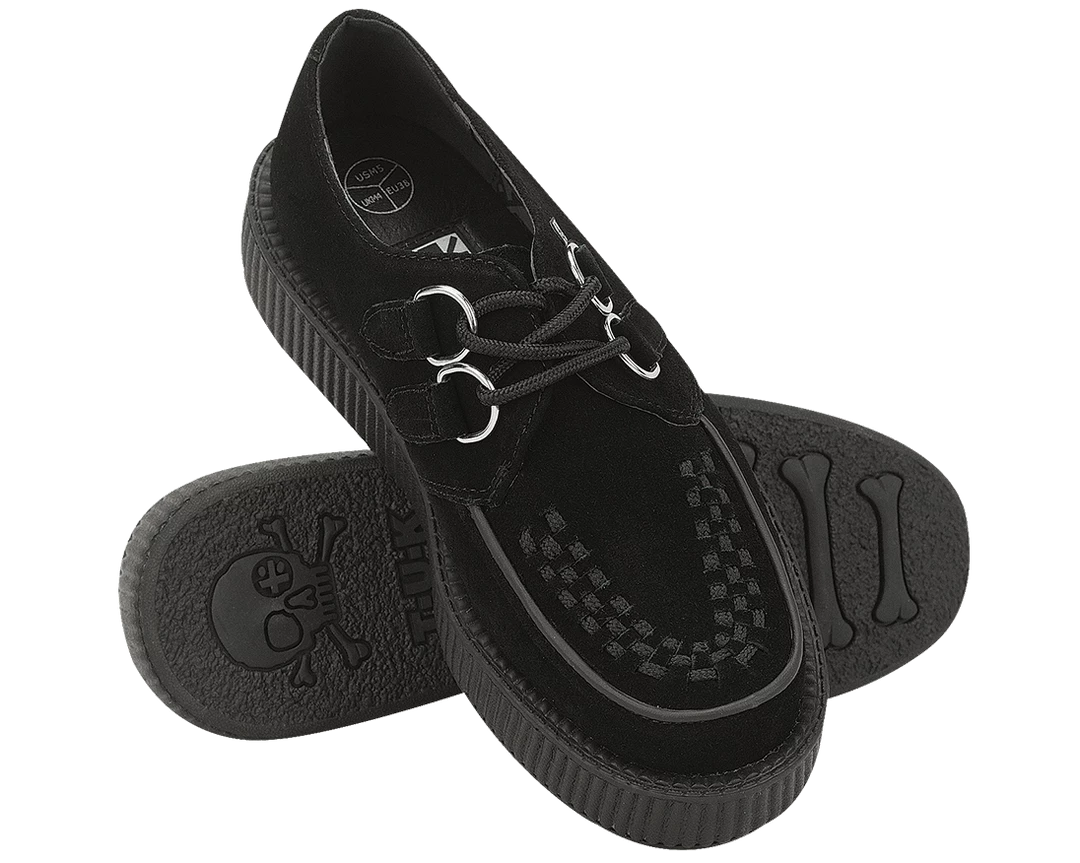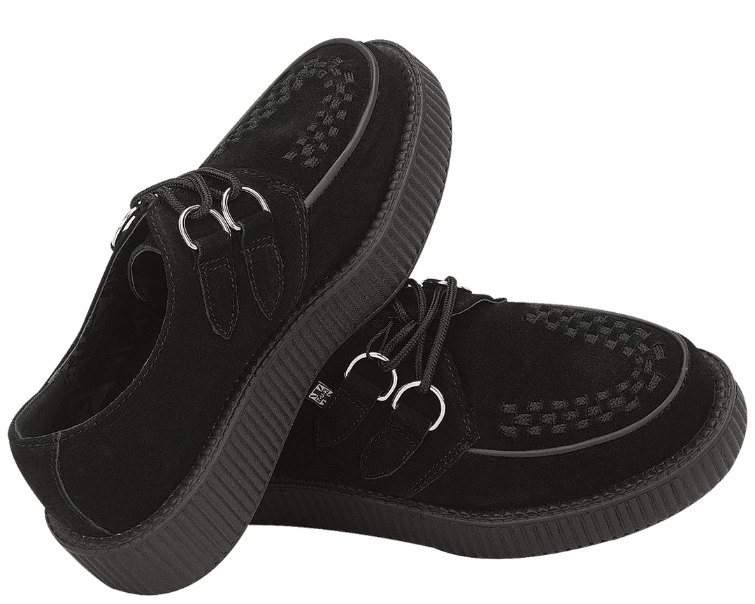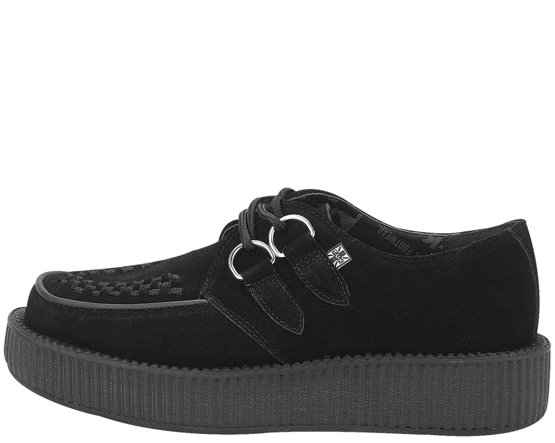 These black suede T.U.K. Low Sole Viva Creepers feature the new lightweight and more flexible soles in the traditional 1 1/2″. These round toe creepers have a black woven interlace, and silver metal D-rings.