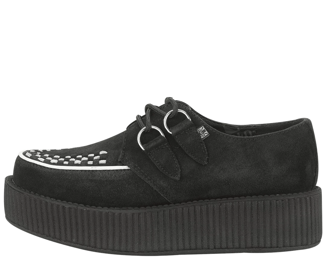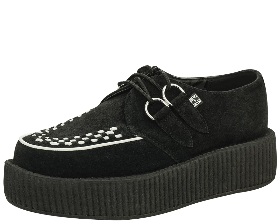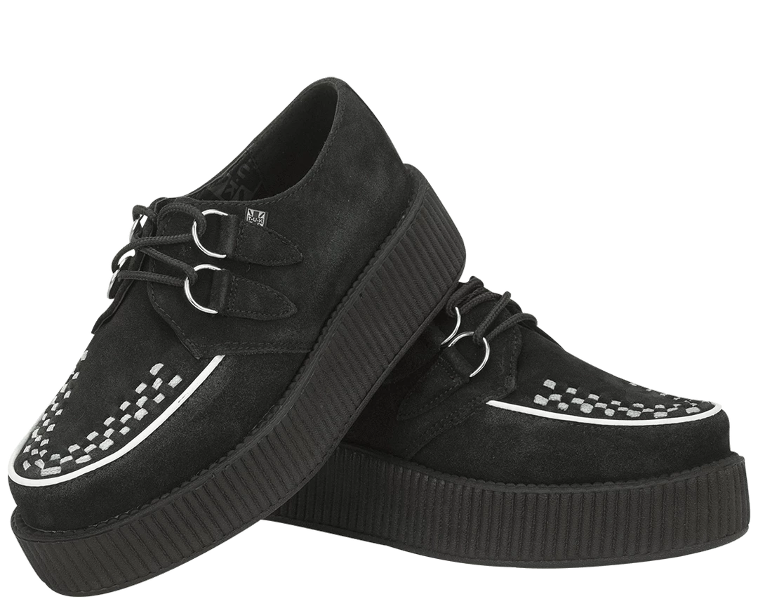 These black suede creepers have contrasting white interlace and feature the new lightweight and more flexible soles in the traditional 1 7/8″ Mondo height. These creepers have a black woven interlace, and silver metal D-rings.