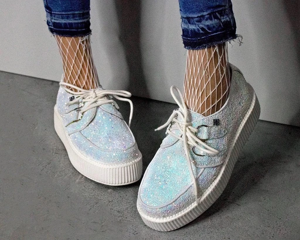 Serve up some snow queen (or king) realness and let it go with these creepers. Features a white sole with a vegan friendly all-over white glitter upper for a frosty iridescent touch. These super chill shoes will easily work their way into your platform faves! Sits on top of our lightweight VIVA mondo sole that is approximately 1 ¾” at the heel and 1 ¼” in the front. Has removable gel insoles for added comfort.