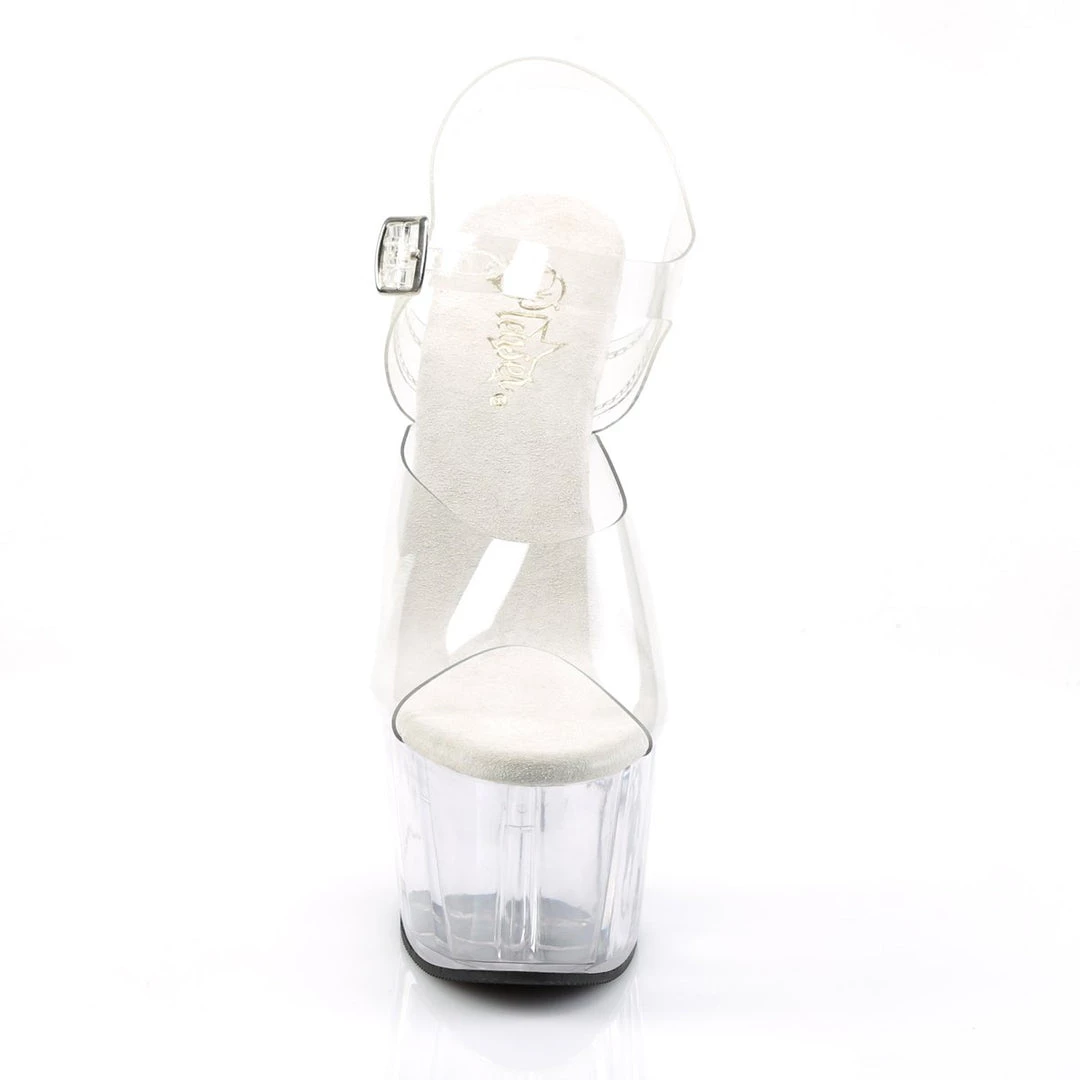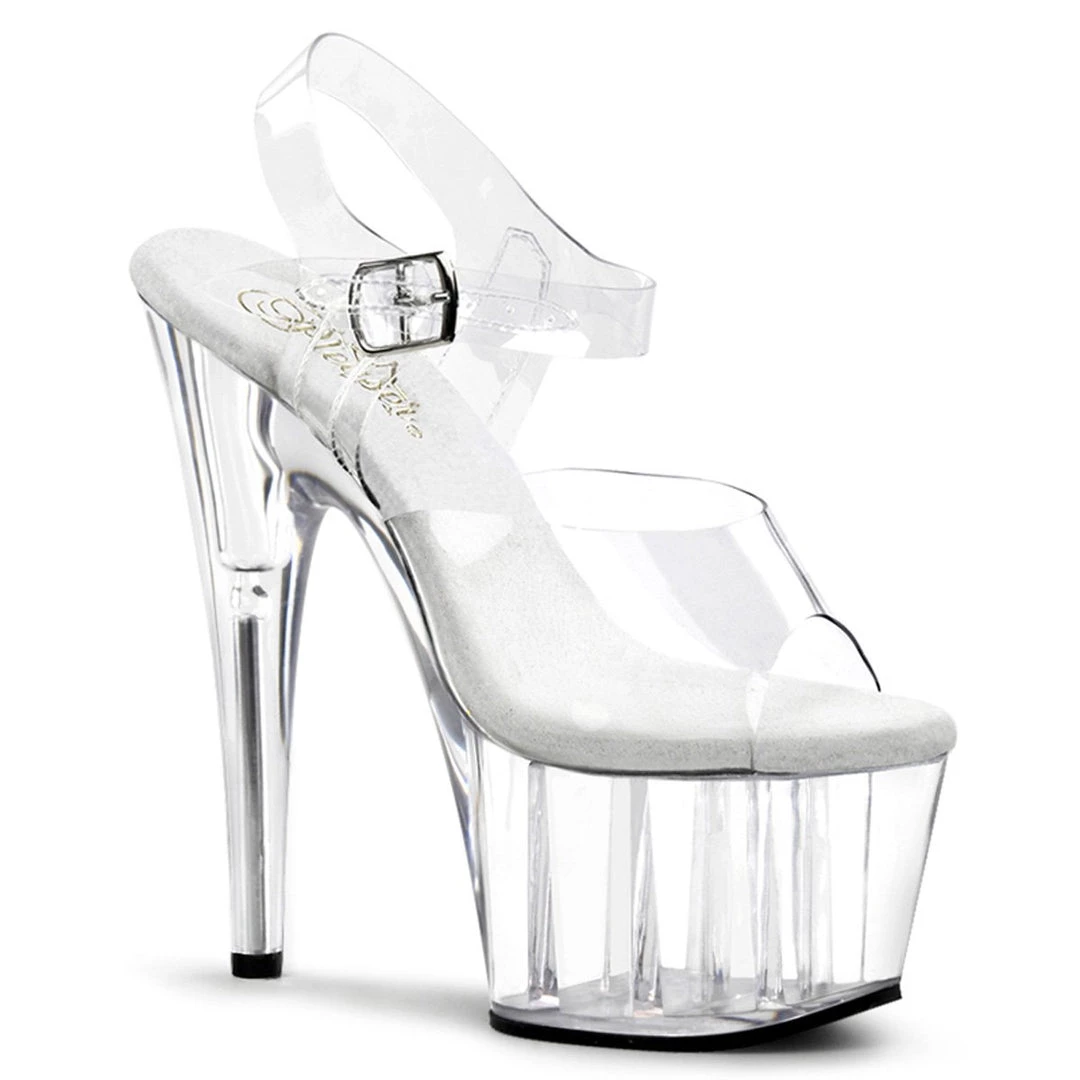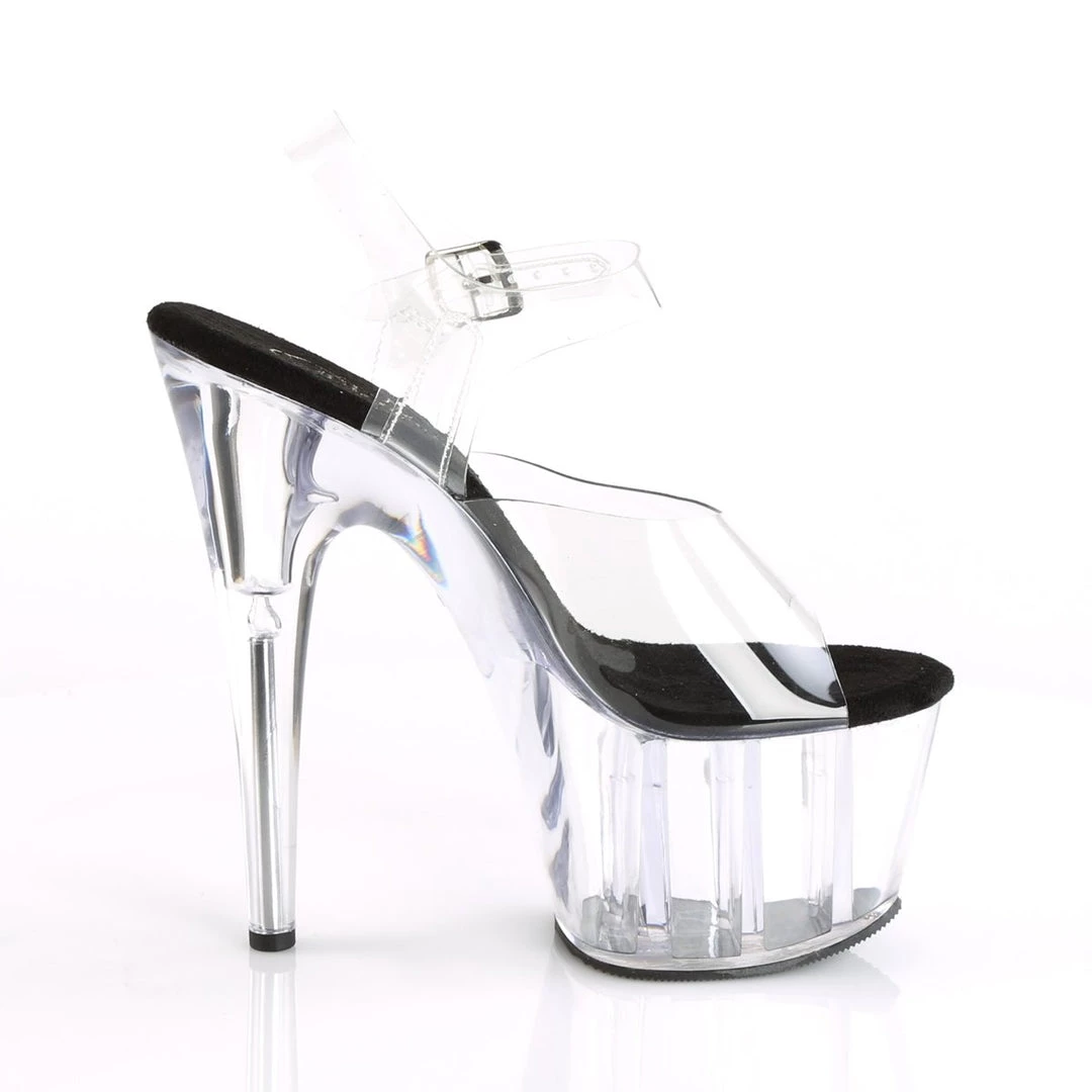 Delicate clear sandals with single strap in toe area and adjustable ankle strap with metallic buckle closure on the exterior side for a perfect fit. The inner sole is padded with soft fabric for added comfort and great feel. The transparent shows of your pedicure while 7″ heel and 2 3/4″ platform adds a major shot of lift and glam.