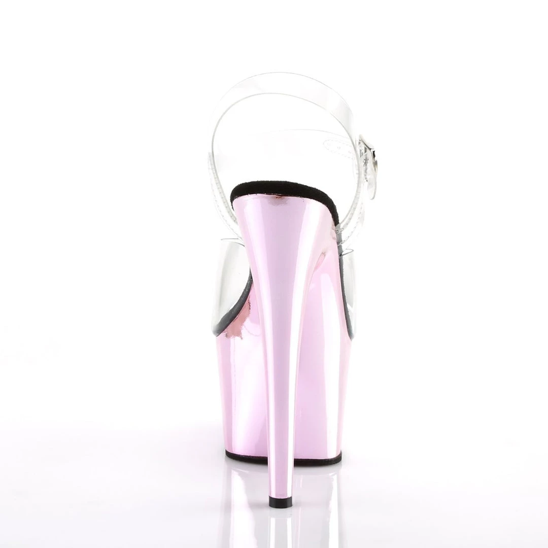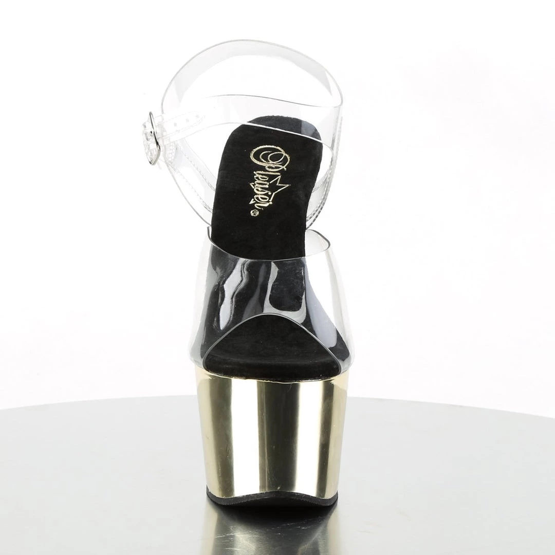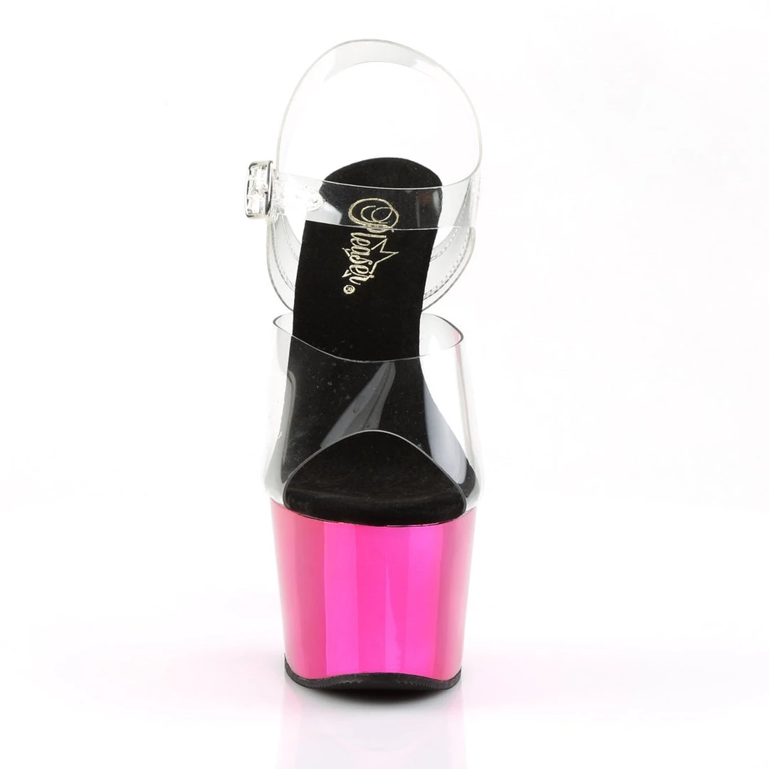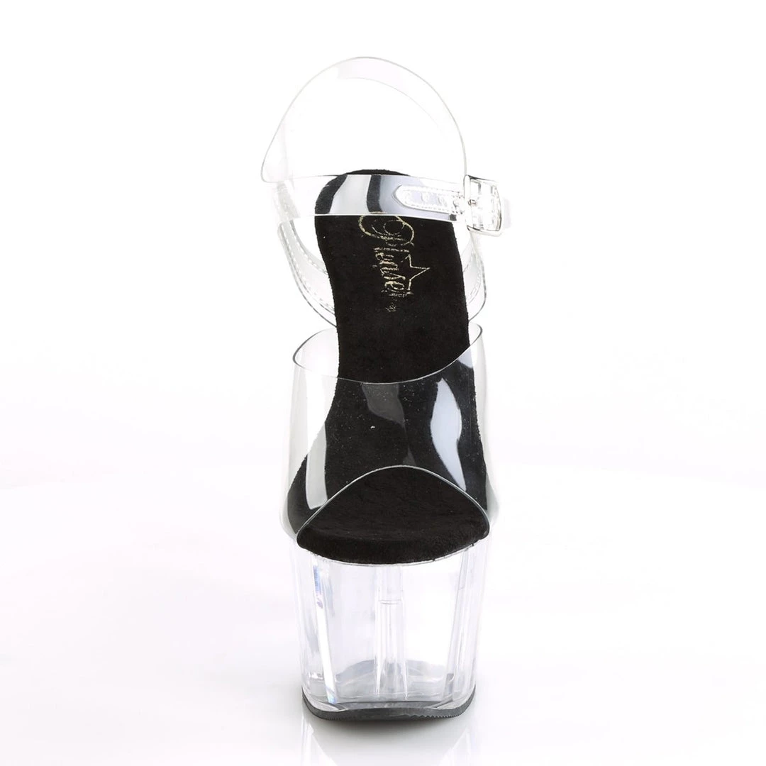 Delicate clear sandals with single strap in toe area and adjustable ankle strap with metallic buckle closure on the exterior side for a perfect fit. The inner sole is padded with soft fabric for added comfort and great feel. The transparent shows of your pedicure while 7″ heel and 2 3/4″ platform adds a major shot of lift and glam.