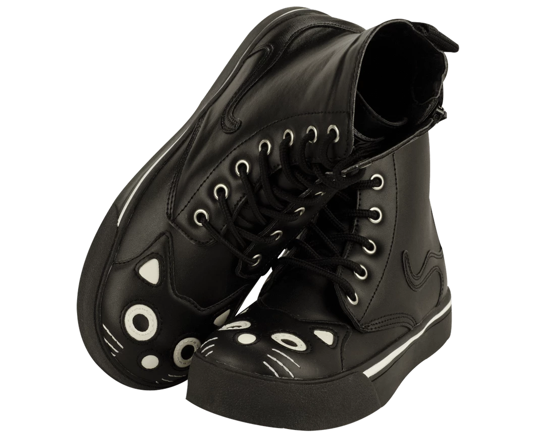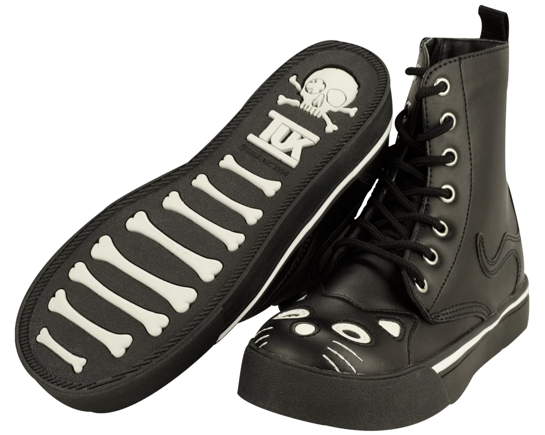 The original T.U.K. kitty sneaker boot is back and ready to attack! This boot is all man made materials; black faux leather with the original T.U.K. skull and bones sneaker sole and black faux leather T.U.K. kitty face with white accents on the toe. And watch out for the black kitty tail whipping around the side- this kitty is feisty and ready to pounce! 7 eyelet lace up front and an inside zip helps you not have to unlace to take off and put on.