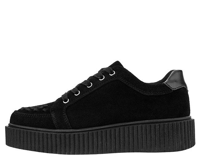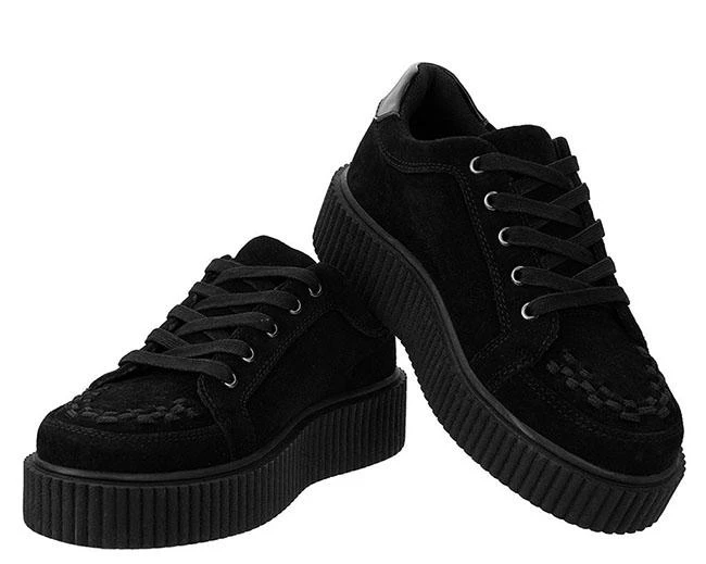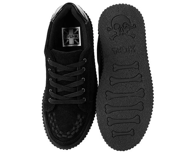 For the rule-breakers, concert-goers, and adventurous shoe lovers, get ready to elevate your shoe game in the Casbah Creepers. A twist on the classic sneaker silhouette injected with signature T.U.K. elements for the perfect dose of street & punk rock style. Features a black cow suede upper with our iconic interlace detail along the front. Sits on top of the TUK traditional creeper sole that is about 1 ½” at the heel and 1” in the front. Has removable gel insoles for added comfort.