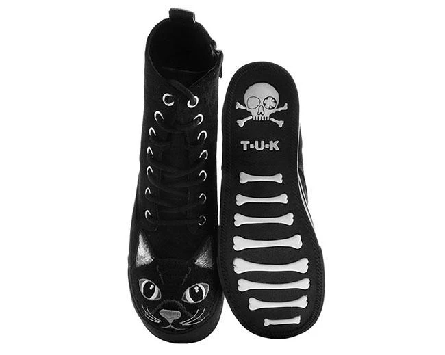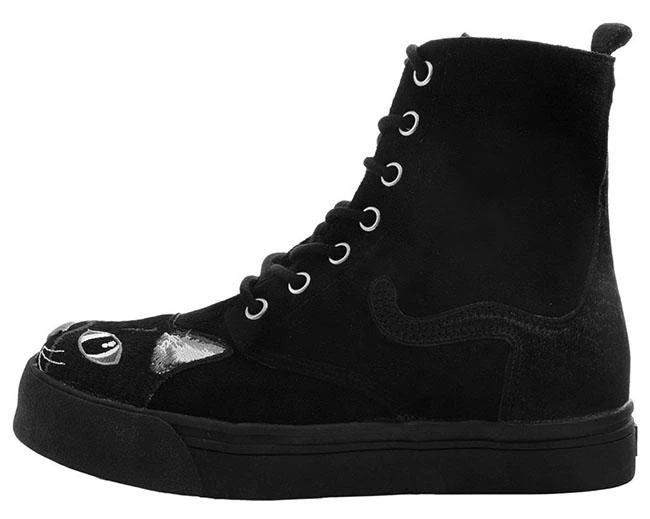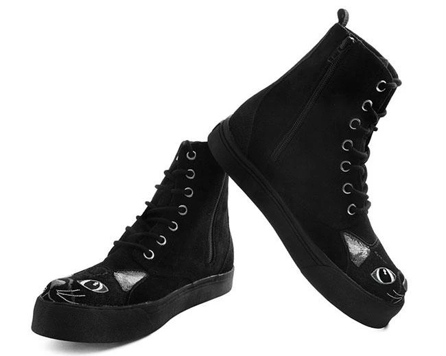 Watch out, there’s a new cat in town! A twist on one of our popular classics, this sneaker boot is easy to love with its intricate and fetching embroidered kitty face complete with a tail along the side. Features a vegan friendly black faux sheep suede upper, 7 eyelet lace-up, and side zipper for easy on/off.