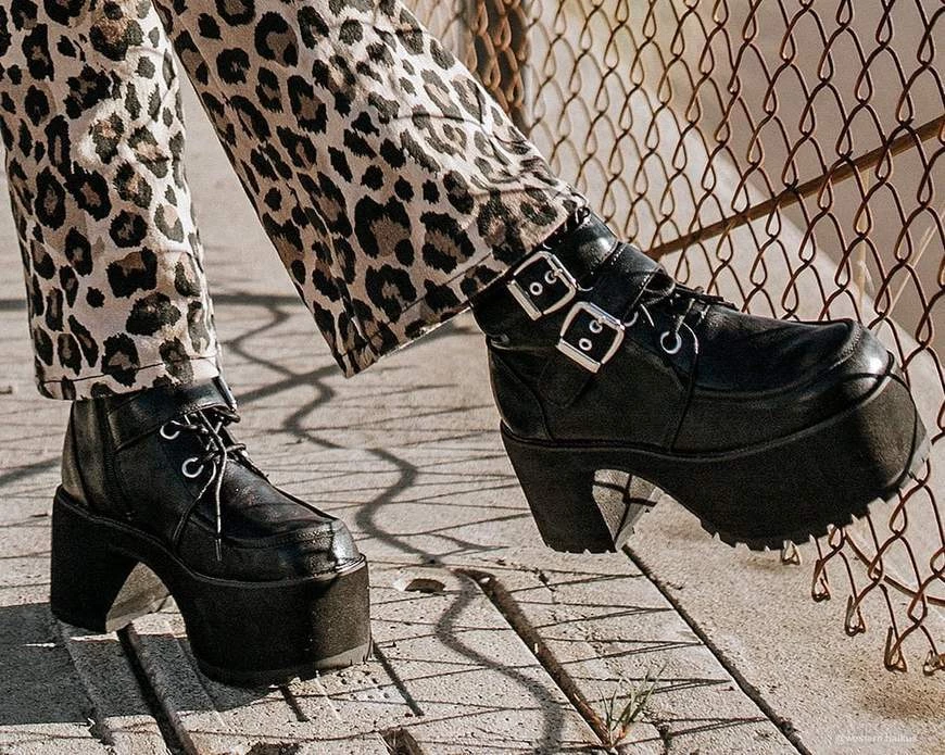 Calling all grunge babes! We’ve got the perfect platform booties for you. Stay a step above the rest in these stunners featuring a distressed black faux leather upper with a double chunky buckle strap detail across the ankle. These platform boots have a 3.5” block heel height for a sturdy, elevated lift and features side zip closure for easy on/off wear. Vegan friendly and made of all man-made materials.