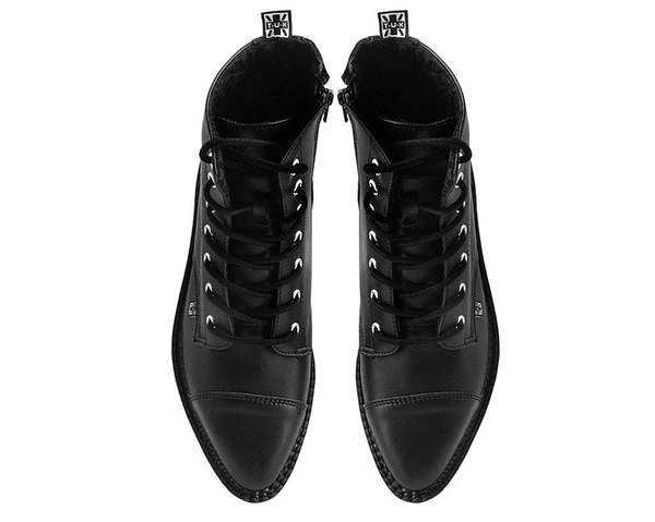 Stomp it out in sharp street style with these killer creeper boots. Features a sleek all black upper made of our vegan friendly high quality TUKskin™ material — polishable synthetic faux leather that is both soft and breathable. These pointed toe booties have a 7-eyelet lace up detail and a platform sole height that measures 1 ¼” at the heel and ¾” in the front. Has removable memory foam insoles for added comfort and inside zipper closure for easy on/off.