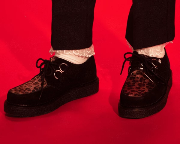 Our new 1970 Original Creepers collection brings us back to where creepers began. Shoes made to make you feel like a rock star. Features a classic weighted sole made of natural rubber that stands at approximately 1.5” at the heel and 1“ in the front. These round toe creepers feature a black cow suede upper with brown leopard on the vamp and silver metal D-rings for lace-up. Includes removable memory foam insoles for extra comfort.