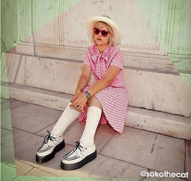 These white leather T.U.K. Viva Mondo Creepers look sharp and feel light with the new lightweight and more flexible round toe VIVA soles in our traditional 1 7/8″ Mondo height. These creepers have a black woven interlace, and silver metal D-rings.